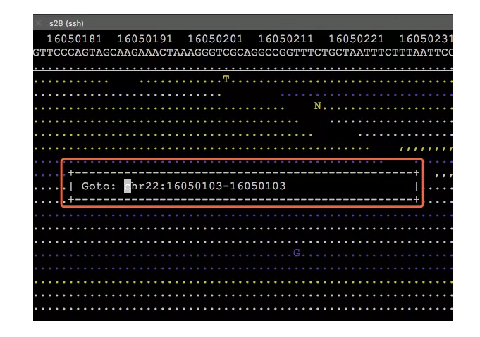 虽然看起来不如IGV体验那样好,功能也比较单一(仅可以查看比对情况),但可贵之处在于可以在终端里面直接操作,当需要快速查看某个位置的比对情况时,操作效率非常高。而如果要退出该模式,也非常简单,按下q键就可以了。