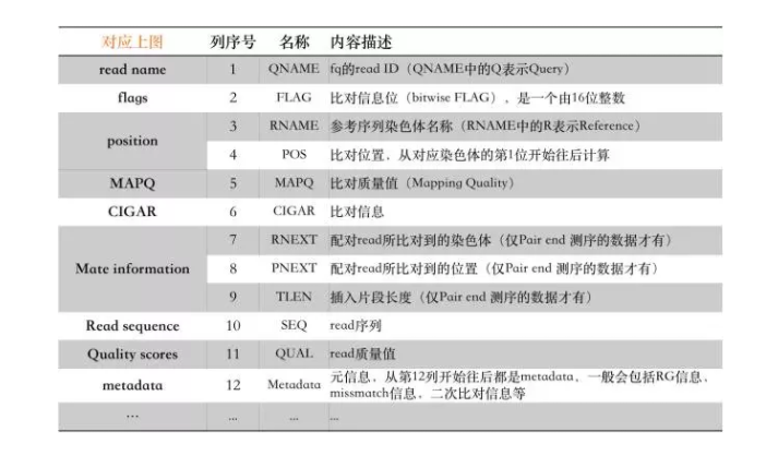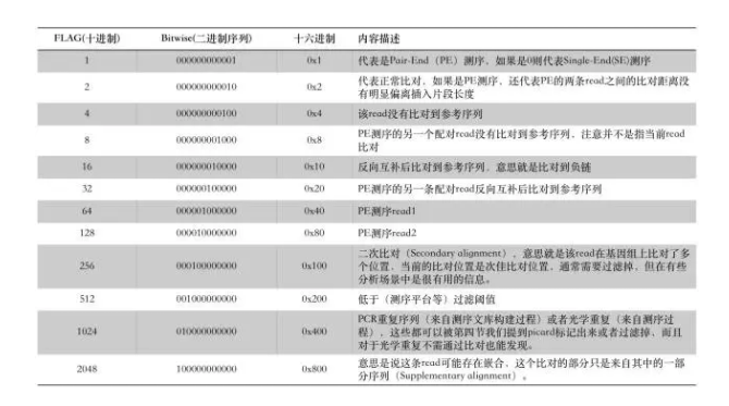 以上,前11列是所有BAM文件中都必须要有的信息,而且从描述中我们也能够比较清楚地知道其所代表的含义。但其中,有几个信息实在太重要了,以至于我认为有必要对其进行详细说明。